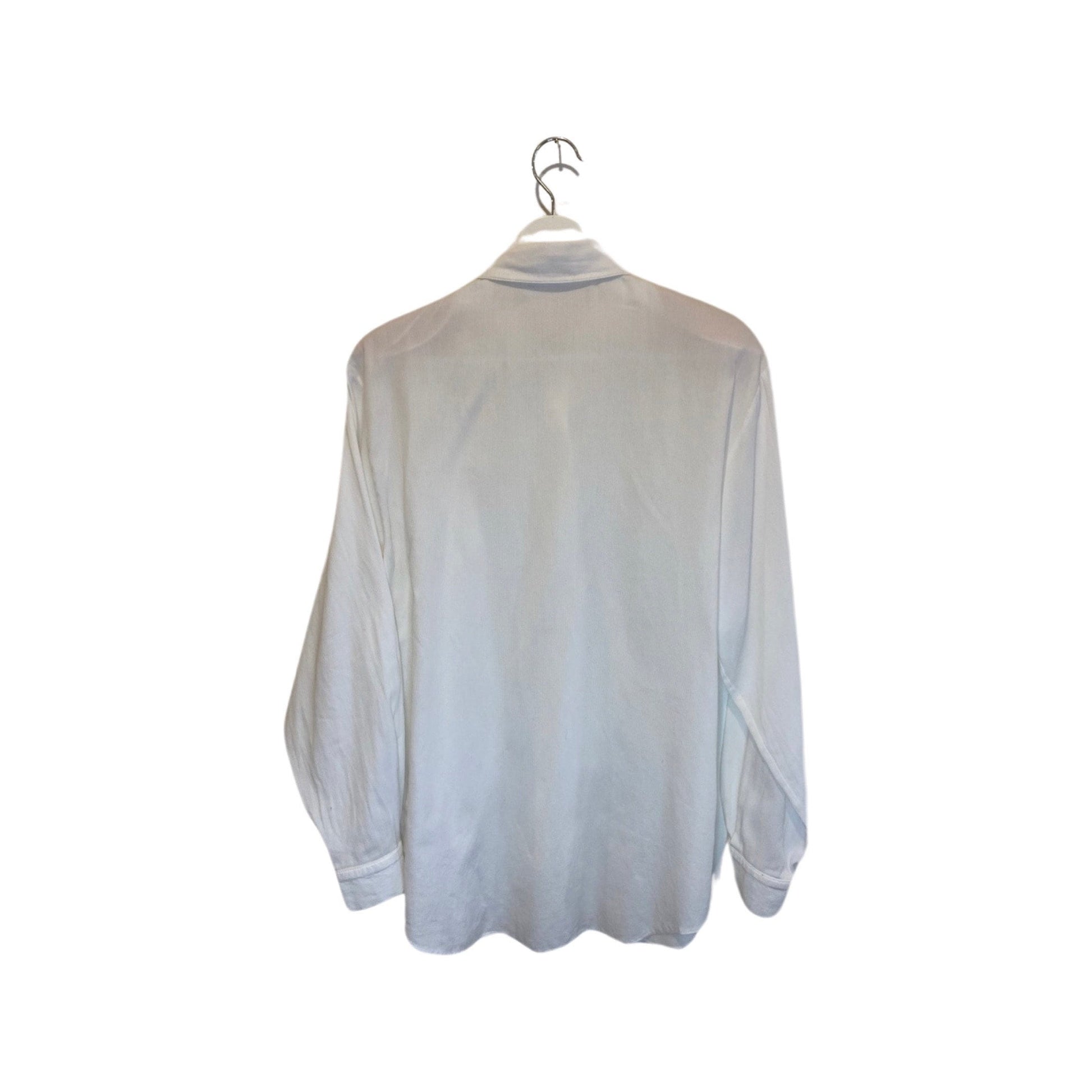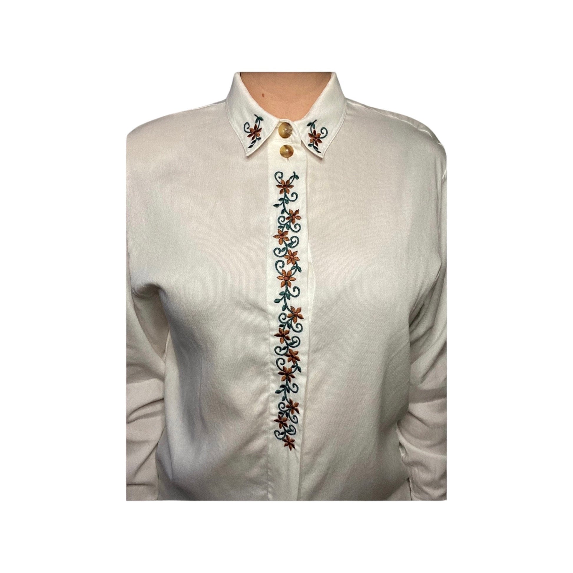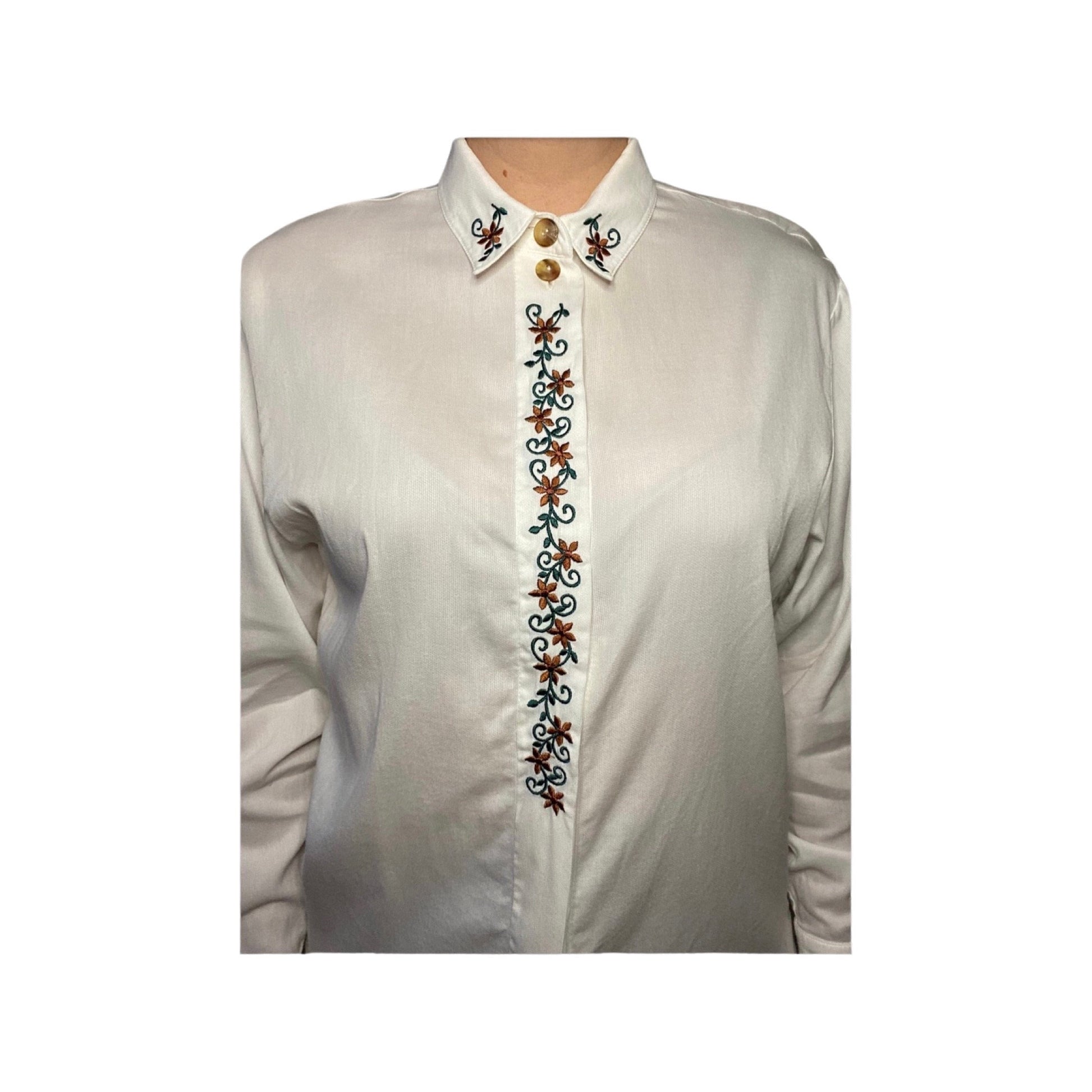 Vintage embroidered blouse, white button down, size Medium, long sleeve button up top, made in Turkey, cuffed dress shirt